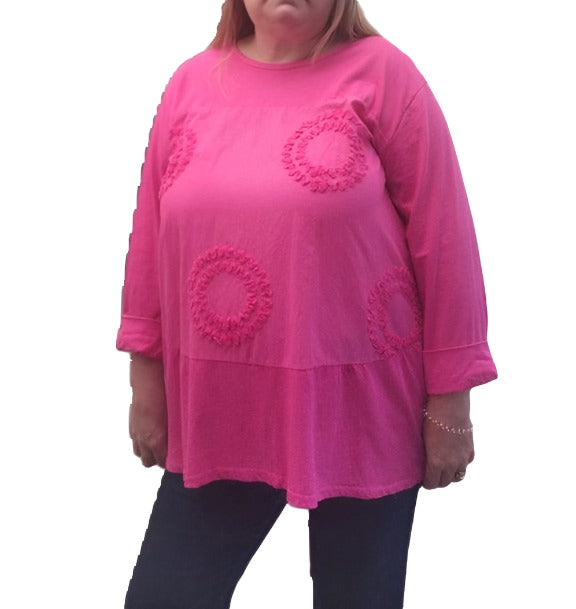 This Circle Applique Pattern Cotton Top is a stylish addition to any wardrobe. Made from high-quality cotton, it features a unique circle applique pattern that adds a touch of sophistication to the design. With its soft and breathable fabric, this top offers both comfort and style. Elevate your fashion game with this versatile and trendy top.