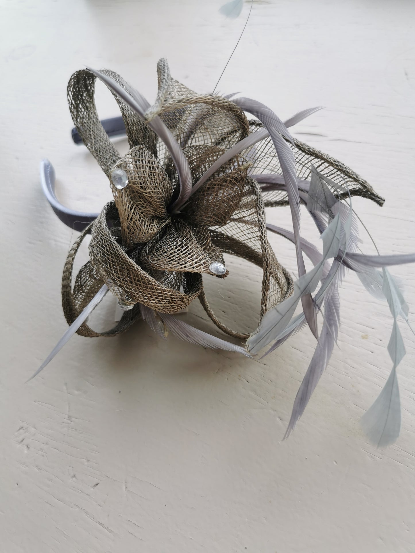 Flower Fascinator n a Satin alice band with feathers and Clear acrylic stones