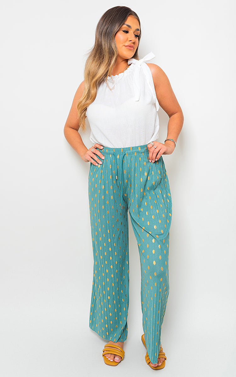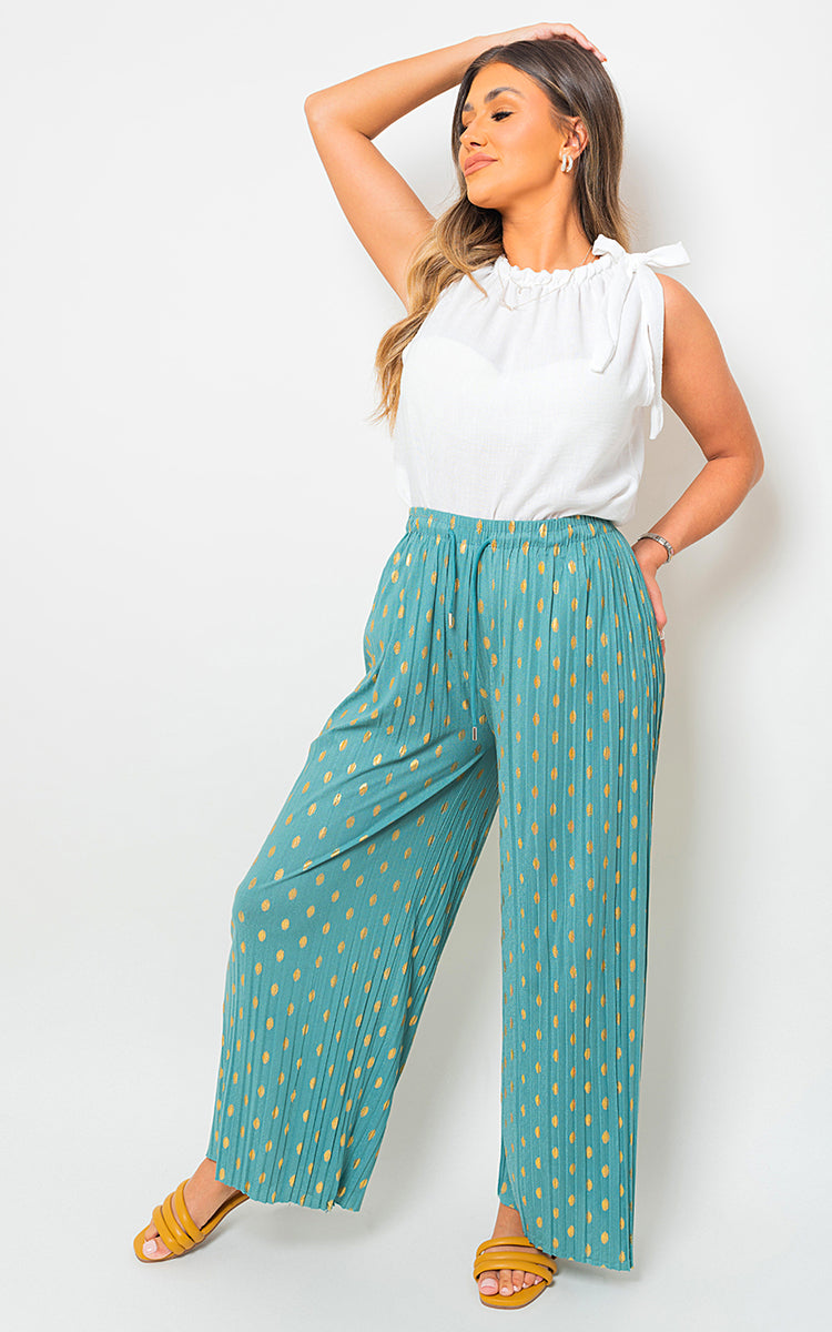 Featuring gold spot detailing, the Ella trousers exude a touch of glamour that adds a hint of luxury to your ensemble. The pleated design adds texture and movement, while the drawstring waist offers a customizable fit that flatters your figure. πππ